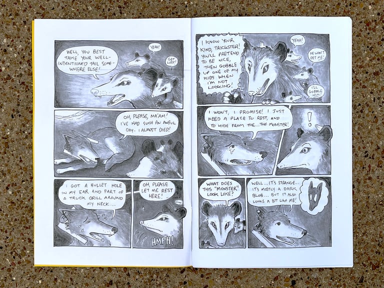 Poor Coyote is a serial comic in which a coyote has surreal adventures, making friends and getting into trouble. In this issue, coyote discovers the origin of the strange monster that pursues him across the desert.